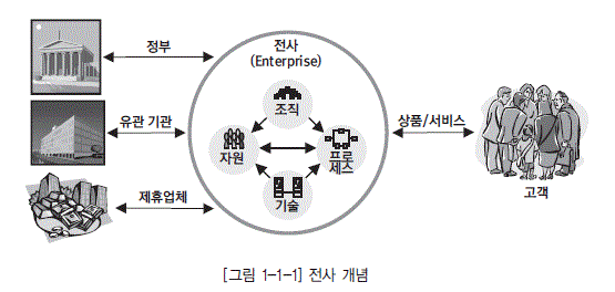 전사(Enterprise)란 일반적으로 기업 또는 기관을 지칭한다. 정확하게 정의하면“공동의 목표를 추구하기 위해 고객과 상품 또는 서비스가 존재하고 이를 지원하기 위한 조직, 자원, 기술을 보유하며 필요한 업무 프로세스를 수행하는 조직의 집합체”라고 할 수 있다. 전사는 비즈니스의 변화 동인을 확인하고 전략을 정의할 수 있는 조직 단위이며, 비즈니스 활동 정보를 공유하는 조직 단위라고 할 수 있다.