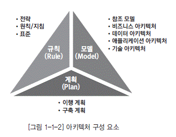 아키텍처는 대상에 대한 구조뿐만 아니라, 대상 구조의 유지 관리를 위한 원칙과 지침, 그리고 향후 목표 아키텍처로 가기 위한 계획을 포함하고 있다.