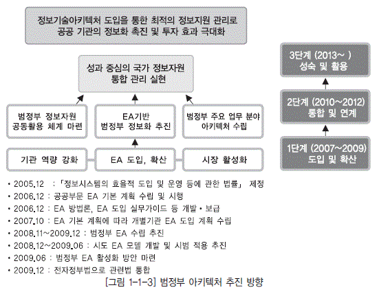 전사아키텍처는 최근 세계적으로 정부기관과 민간기업의 IT 혁신을 위한 주된 관심사로서, 다양한 산업에 걸쳐 전사아키텍처 프로젝트가 추진되고 있다. 특히 정부기관의 경우 전 세계적으로 전자정부 구현 사업이 활발히 추진되고 있다. 국내 정부기관도 전사아키텍처 추진 사업을 범정부 차원의 전 자정부 구현 과제 중의 하나로서 활발히 추진하고 있다. 2005년 12월 공공 부문에 전사아키텍처 도입을 의무화하는“정보시스템의 효율적 도입 및 운영 등에 관한 법률”이 제정된 것을 기반으로, 공공 부문의 정보 자원을 최적으로 관리하고 정보화 투자 효과를 제고하기 위하여 2007년부터 단계적으로 전사아키텍처가 추진되고 있다.