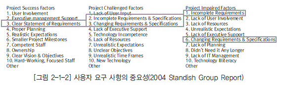 - [그림 2-1-2] 사용자 요구 사항의 중요성(2004 Standish Group Report)