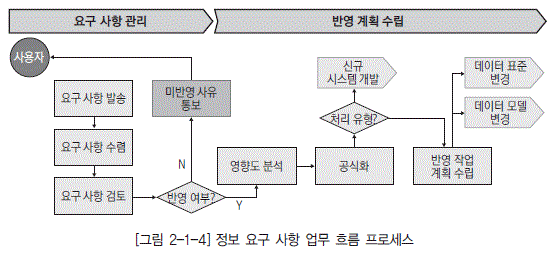 - 정보 요구 사항을 관리하기 위한 프로세스는 6개의 주요 모듈로 이루어져 있다(요구 사항 발송, 요구 사항 수렴, 요구 사항 검토, 영향도 분석, 공식화, 반영 작업 계획 수립).