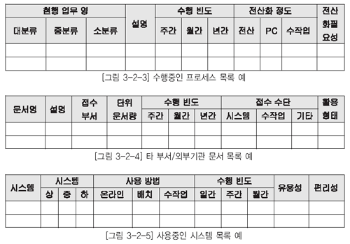- [그림 3-2-3] 수행중인 프로세스 목록 예 / [그림 3-2-4] 타 부서,외부기관 문서 목록 예 / [그림 3-2-5] 사용중인 시스템 목록 예