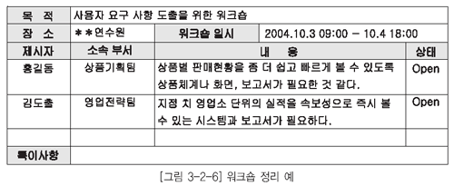 사용자 워크숍을 통해 도출된 요구 사항이나 해결 과제들을 명백하고 간결한 문장으로 정리한 후 사후 대처할 수 있도록 한다. 해결과제에 대해서는 별도의 ID를 부여하여 관리한다. 워크숍 결과 정리시에는 다음 사항을 포함한다.