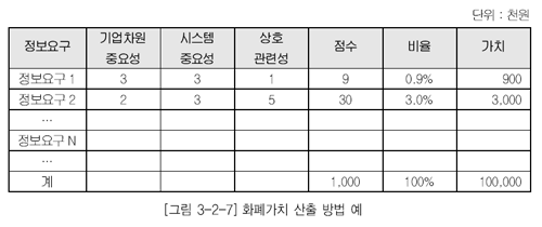 - 전체 정보 요구 사항에 대하여 앞서 계산된 점수를 더하고, 점수 합계를 100으로 하여 각각의 정보 요구 사항 가치를 백분율(%)로 환산한다.