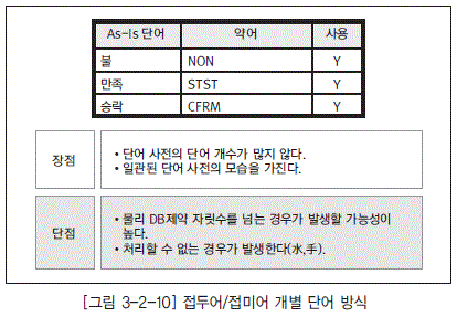 - 대부분의 DBMS는 테이블 물리명 및 칼럼 물리명의 첫 글자를 알파벳으로 시작하도록 제약하고 있다. 따라서 표준 단어의 영문명도 반드시 알파벳으로 시작하도록 정의하도록 한다.
