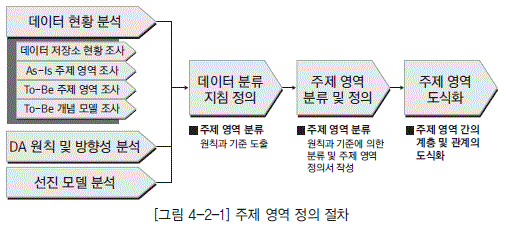 주제 영역(Subject Area)은 기업이 사용하는 데이터의 최상위 집합이다. 예를 들어, 제조 업체의 경우 인사, 생산, 자재, 판매 등의 주제 영역이 있을 수 있다. 하나의 주제 영역으로 정의되는 데이터간의 관계는 밀접하고, 다른 주제 영역에 포함되는 데이터 간의 상호작용은 최소화할 수 있도록 정의한다. 데이터는 기본적으로 관계 구조로 표현된다. 관계 구조는 데이터 간의 관계가 복수 개로 표현되면서 서로 연결되어 있기 때문에 하향식(Top-down) 분석이 용이하지 않다. 계획 수립 단계는 하향식 분석을 원칙으로 하고, 검증을 위해서 부분적으로 상향식 분석을 사용한다. 데이터를 하향식으로 분석하기 위한 개념으로 유용한 것이 주제 영역이다. 주제 영역은 계층적으로 표현될 수 있다. 주제 영역을 분해하면 하위 수준의 주제 영역이나 엔터티가 나타난다.