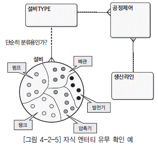 [그림 4-2-5]에 있는 엔터티를 검토해 보자. 이 그림은 어떤 생산 공장에 있는 생산에 관련된 설비를 정의한 엔터티이다. 여기에 들어 있는 개체를 크게 나누어 펌프, 탱크, 배관, 발전기, 압축기 등으로 분류했다고 하자. 이러한 분류를 모델링에서는 서브타입(Sub-type)이라고 한다. 이 분류가 그 림에서처럼 단지 설비를 분류하는 데에만 사용한다면-그것이 비록 나중에 코드화를 함으로써 별도의 엔터티로 생성된다고 하더라도-지금 단계에서 굳이 엔터티로 도출할 필요가 없다. 그 이유는 지금 엔터티로 도출한 것이나 나중에 정규화 단계에서 도출한 것이나 별차이도 없으면서 초기 단계의 복잡성만 가중시키기 때문이다.