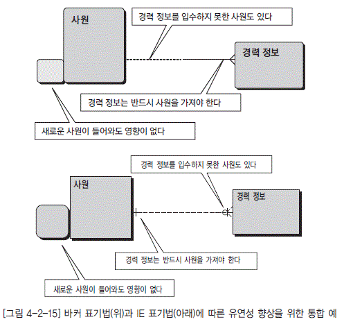 - [그림 4-2-15] 바커 표기법(위)과 IE 표기법(아래)에 따른 유연성 향상을 위한 통합 예