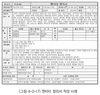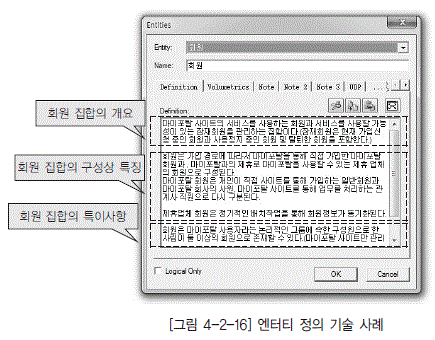 [그림 4-2-16]은 이와 같은 기준에 따라 작성한 엔터티 정의 기술 사례이다.