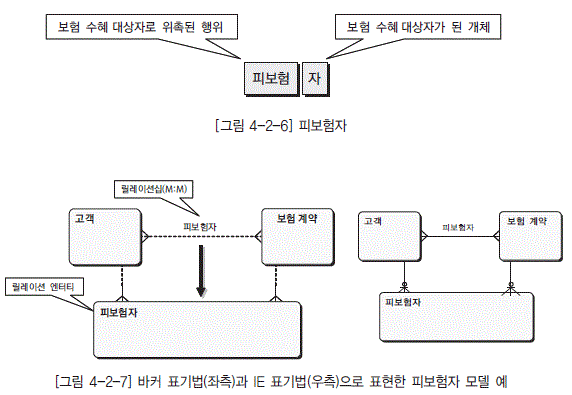 관계가 엔터티로 변하는 경우이다. 관계가 M:M이 되면 더 이상 관계로만 존재할 수 없기 때문에 엔터티로 바뀌게 되며, 이를 릴레이션 엔터티라고 한다. 예를 들어 피보험자란 단어를 분석해 보면, [그림 4-2-6]에 있는 것처럼 보험 수혜자로 위촉되었다는 행위와 그 수혜자가 된 사람의 개체가 결합되어 있어 순수한 본질 집합이 아니기 때문에 관계가 분명하다.