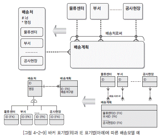 - [그림 4-2-9] 바커 표기법(위)과 IE 표기법(아래)에 따른 배송모델 예