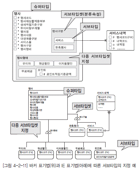 - [그림 4-2-11] 바커 표기법(위)과 IE 표기법(아래)에 따른 서브타입의 지정 예