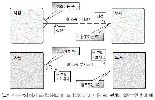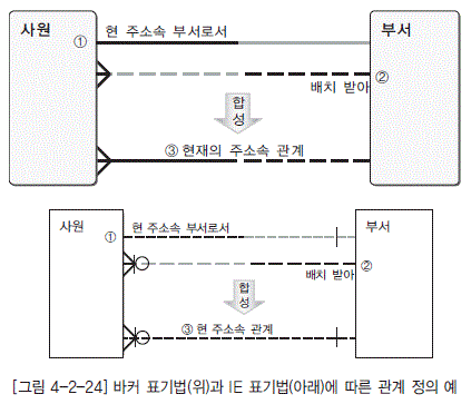 - [그림 4-2-24] 바커 표기법(위)과 IE 표기법(아래)에 따른 관계 정의 예