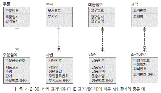 - [그림 4-2-30] 바커 표기법(위)과 IE 표기법(아래)에 따른 M:1 관계의 종류 예