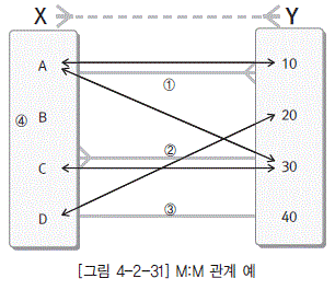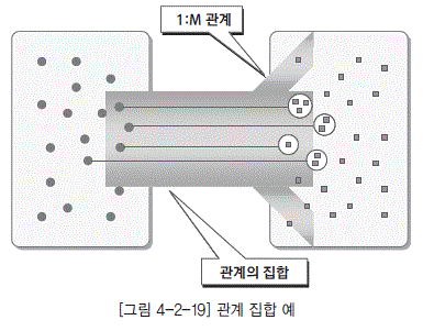 [그림 4-2-24]와 같이 두 집합 간의 관계는 두 집합 각각의 관점에서 바라 본 관계가 궁극적으로는 합성된 형태가 완성된 관계가 된다. 이 관계에 대해서 각각의 관점에서 생각하고 판단해야 할 사항은 예를 들면 다음과 같다.