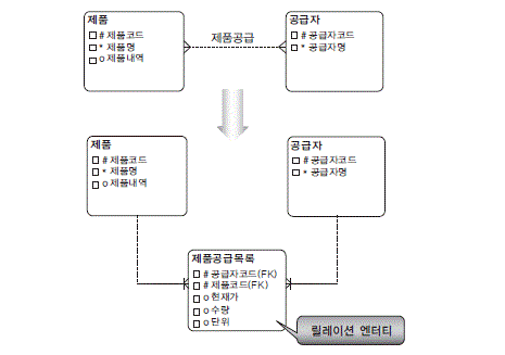 - M:M 관계를 해소시켜 관계 엔터티를 생성하는 것을 말하는 것이다. 이 방법은 앞으로 설명할 양호한 유연성을 얻는 대가로 새로운 엔터티가 추가되는 비용이 발생한다. 물론 특별하게 관리할 가치가 있다면 얼마간의 비용이 발생하더라도 그렇게 관리해야 한다는 것에는 이론의 여지가 없다.