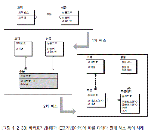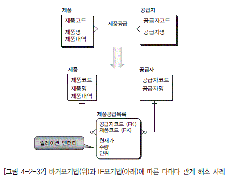 - [그림 4-2-32] 바커표기법(위)과 IE표기법(아래)에 따른 다대다 관계 해소 사례