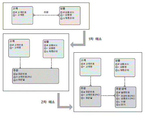 M:M 관계는 관계가 해소되면서 새로운 엔터티(Relation Entity/Intersection Entity)를 생성시킨다. [그림 4-2-32]와 같이 새로 생성된 릴레이션 엔터티와 기존 엔터티 사이에는 1:M 관계로 분해된 새로운 관계가 나타난다. M:M 관계를 분해했을 때 항상 1:M 관계로 분해되는 것은 아니다. [그림 4-2-33]의 상품과 주문 사이의 M:M 관계와 같이 때때로 덜 분해된 M:M 관계가 사이에 나타날 수도 있다. 이 경우 앞의 작업과 동일하게 분해 작업을 수행하여 M:M 관계가 완전히 해소될 때까지 관계를 분해해야 한다.