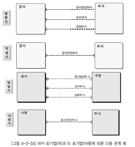 - [그림 4-2-34] 바커 표기법(위)과 IE 표기법(아래)에 따른 다중 관계 예