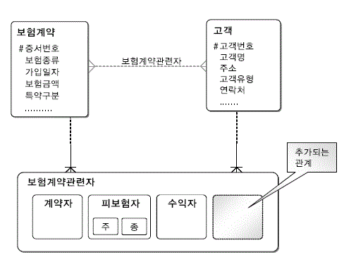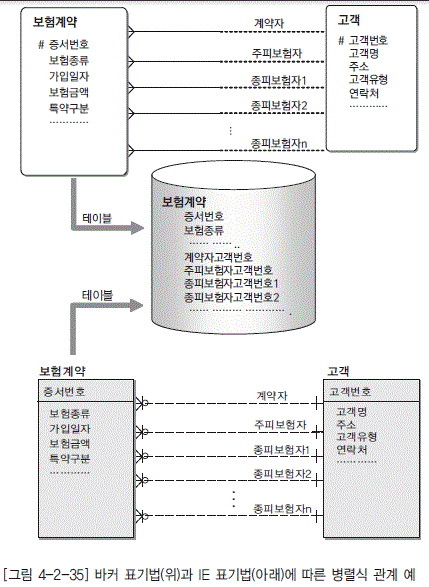 병렬식으로 결정한다는 것은 [그림 4-2-35]와 같이 계약자, 피보험자, 수익자 등을 별도의 관 계로 정의하겠다는 의미다. [그림 4-2-35]의 하단은 이렇게 정의했을 때 나중에 테이블의 구조 (관계형 데이터베이스로 설계 시)가 나타나는 모습을 보여주고 있다.