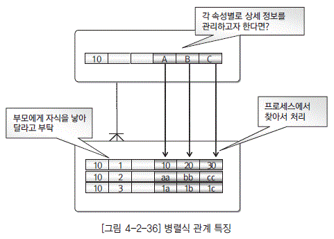 - 병렬식으로 나열된 관계는 기존의 집합을 유지하도록 하는 장점이 있지만, 이들이 칼럼으로 나 열됨으로써 나중에라도 각자에 대한 상세한 정보를 관리할 자식 엔터티를 가질 수 있는 길이 원천적으로 봉쇄된다는 매우 중요한 제한 요소를 가지고 있음을 잊어서는 안된다.