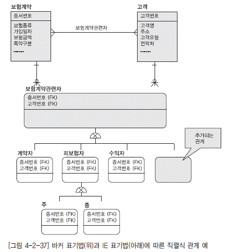 - [그림 4-2-37] 바커 표기법(위)과 IE 표기법(아래)에 따른 직렬식 관계 예