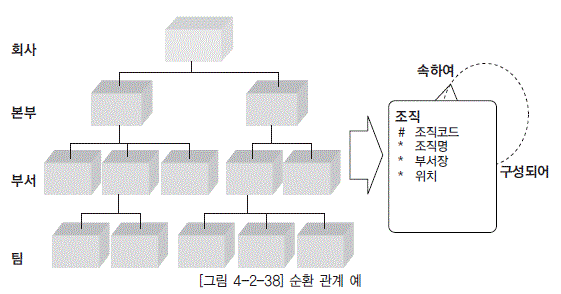 하나의 엔터티가 다른 엔터티가 아닌 자기 자신과 관계를 맺는 관계를 순환 관계(Recursive Relationship)라고 한다. 이와 같은 순환 관계를 표현한 모델을 순환 구조 모델 또는 순환 모델이라고 하며, [그림 4-2-38]의 좌측에 표현된 조직 구조와 같은 계층 구조를 표현하는 데 유용하다.