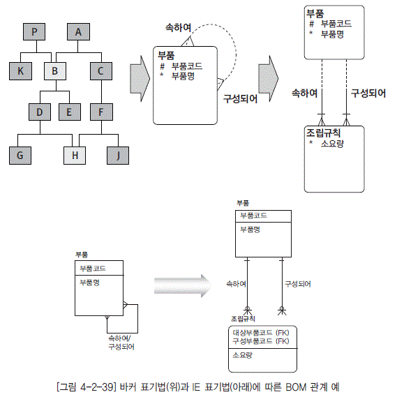 - [그림 4-2-39] 바커 표기법(위)과 IE 표기법(아래)에 따른 BOM 관계 예