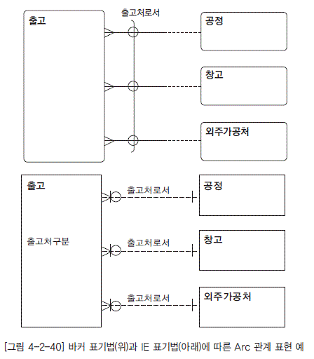 - [그림 4-2-40] 바커 표기법(위)과 IE 표기법(아래)에 따른 Arc 관계 표현 예