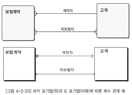 - [그림 4-2-20] 바커 표기법(위)과 IE 표기법(아래)에 따른 복수 관계 예 /