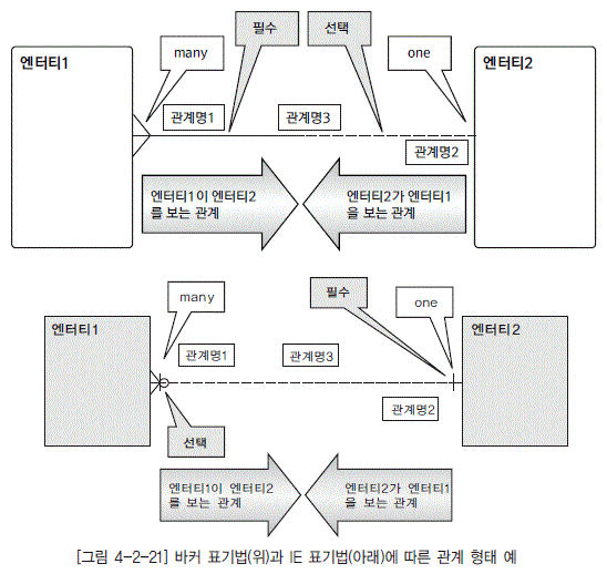 - [그림 4-2-21] 바커 표기법(위)과 IE 표기법(아래)에 따른 관계 형태 예