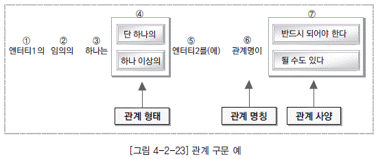 필수(실선), 선택(점선)의 모습을 결정하는 과정이다. 여기서‘반드시 관계명이어야 한다’와‘관계명일 수도 있다’를 결정하기 위해서는 관계명을 만족하는 경우를 아무리 많이 제시하더라도 없을 수도 있다는 한 가지 경우만 예를 들면 결정할 수 있다.