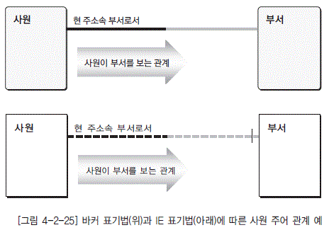 - [그림 4-2-25] 바커 표기법(위)과 IE 표기법(아래)에 따른 사원 주어 관계 예