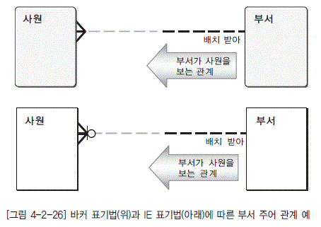- [그림 4-2-26] 바커 표기법(위)과 IE 표기법(아래)에 따른 부서 주어 관계 예