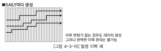 - DAILY마다 생성-아무 변화가 없는 경우도 데이터 생성 그러나 완벽한 이력 관리는 불가능 [그림 4-3-16] 발생 이력 예