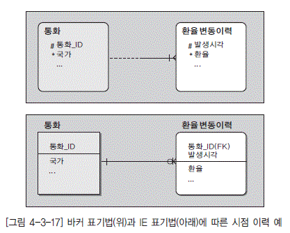 [그림 4-3-17] 바커 표기법(위)과 IE 표기법(아래)에 따른 시점 이력 예