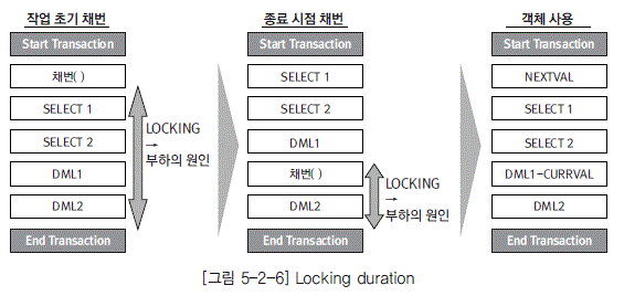 Locking에 의한 경합은 식별자 번호를 얻기 위한 채번 로직에서 많이 발생한다. 따라서 채번은 트랜잭션 종료 시점에 실시하여 locking duration을 최소화하거나 시퀀스나 데이터 타입으로 자동 번호 발생 객체를 사용한다.