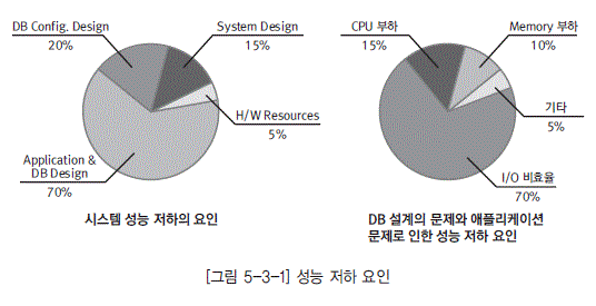 시스템 성능 문제는 하드웨어(CPU, 메모리, 네트워크 등) 자원 부족, DBMS 설계, SQL 비효율 등의 문제로 발생되는 경우가 대부분이다. 많은 비용을 들여 고성능의 하드웨어 교체 및 증설을 통해 성능상의 문제를 해결하기 이전에 데이터베이스의 성능상 문제점을 파악한 후 문제점의 튜닝을 통한 데이터베이스의 최적화를 우선적으로 고려해야 한다.