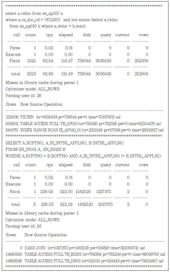 | 악성 SQL의 분포 추정 | .TKPROF utility에 의해 처음 생성된 파일의 크기와 Fl scan 및 cputime에 의해 추출된 결과 파일의 크기를 비교하여 전체 SQL대비 악성 SQL의 비율을 추정할 수 있음 |