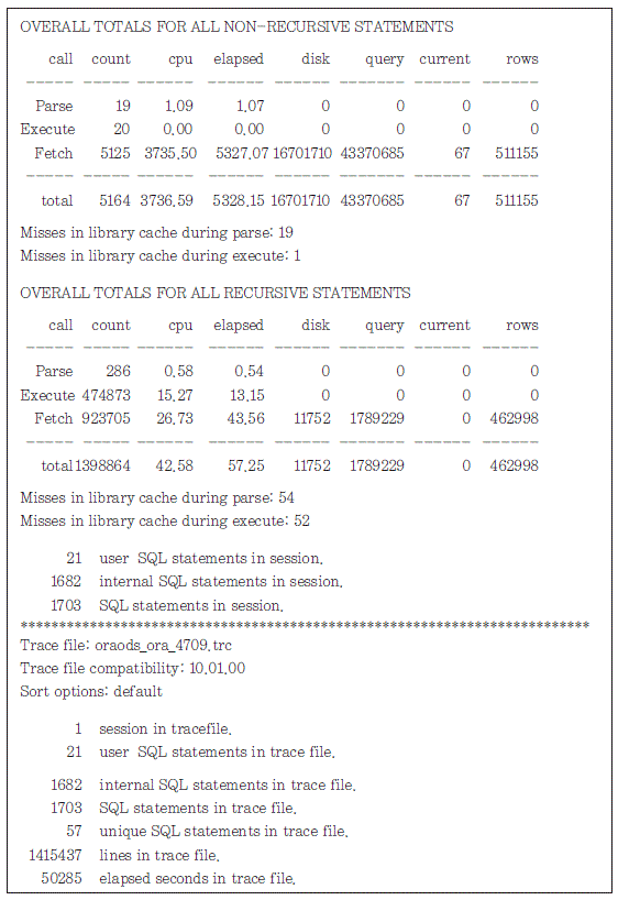 써머리 부분은 Tkprof로 변환한 모든 트레이스 파일에 대한 실행 통계를 누적한 부분으로, 사용 자가 요청한 SQL을 직접적으로 처리하기 위해 수행한 실행 통계는 NON-RECURSIVE에 집계되 고, 추가적으로 수행한 실행 통계는 RECURSIVE에 집계된다.