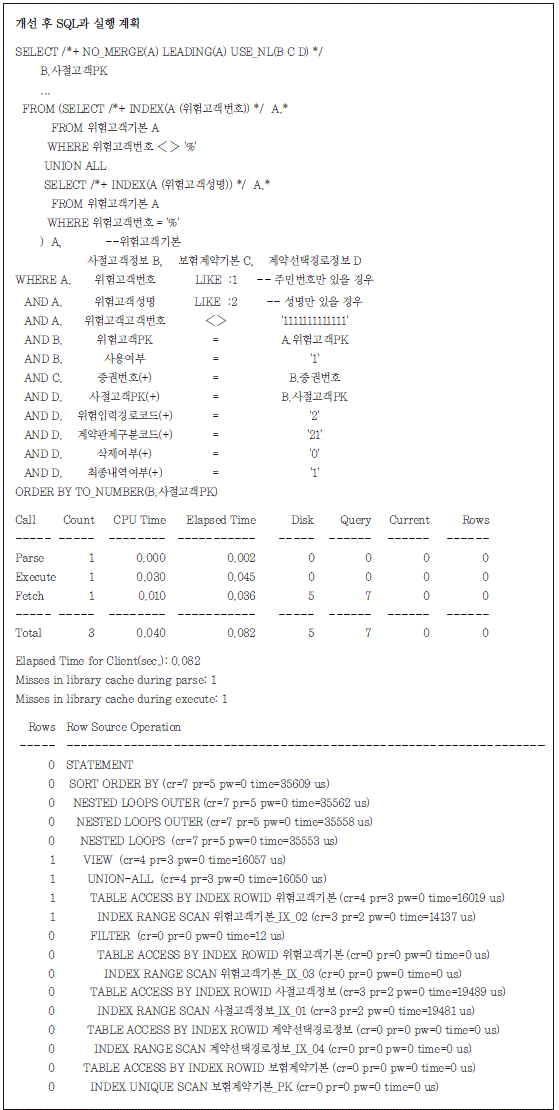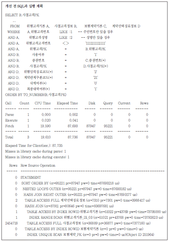 이 비효율을 개선하기 위해서는 위험고객기본 테이블을 차례로 액세스하면서 그 결과를 가지고 사 절고객정보 테이블을 탐침할 수 있도록 Nested-Loop 조인으로 조인 방식을 변경하여야 한다. 마지막 비효율은 계약선택경로 테이블과의 조인 방식에 대한 부분이다. 계약선택경로 테이블의 경 우 코드성 테이블로 비교적 적은 집합이라 해쉬 조인으로 인한 비효율이 크게 나타나지 않았다. 하지 만 선행 집합이 아주 작은 집합이므로 선행 집합의 결과로 조인을 수행하는 Nested-Loop 조인으로 변경을 해야 한다.