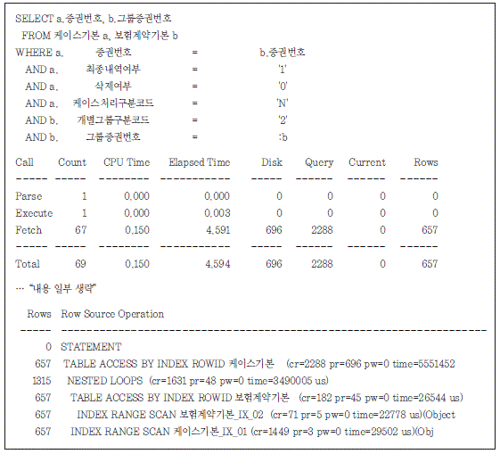 케이스기본 테이블을 657회 탐침하면서 651번의 물리 블록 읽기(pr 696 - pr 45)가 발생하였다는 것은 읽고자 하는 657개의 데이터 로우 각각이 서로 다른 데이터 블록에 저장되어 있다는 의미이다. 이 때문에 처리 시간의 대부분이 651번의 물리 블록 읽기에서 소요되었다. 개선을 위해서는 케이스기본 테이블 로우가 동일한 그룹증권번호로 클러스터링될 수 있도록 테이블 을 정렬하는 것이다.