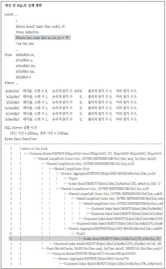 트레이스 파일의 상단에는 테이블별 스캔 수와 페이지 읽기 수가 표시되는데, 위 트레이스 파일에서 는 mBarItm 테이블의 페이지 읽기 수가 매우 큰 것을 알 수 있다. 트레이스 파일의 아래에서 6번째 줄을 보면 IX_mBarItm_01 인덱스를 Index Scan 방식으로 액세스해 0건을 출력했다. 이 부분에 별 다른 비효율이 없어 보이지만 SQL 서버에서 Index Scan 연산은 해당 인덱스를 처음부터 끝까지 스캔 하는 것을 의미하므로 인덱스를 전체 스캔해 결과가 0건이라는 의미이다.