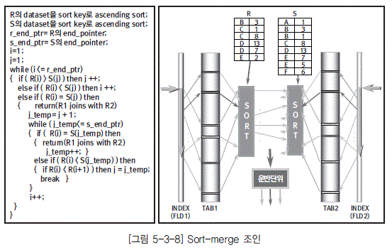 [그림 5-3-8]을 보면 Sort-Merge 조인은 다음과 같은 절차로 수행되고 있는 것을 알 수 있다.