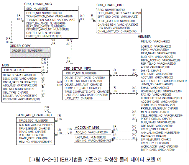 - [그림 6-2-9] IE표기법을 기준으로 작성한 물리 데이터 모델 예
