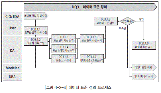 [그림 6-3-4]의 DQ3.1.9 데이터 표준 공표는 정의된 표준화 프로세스에 따라 전사 시스템에 표준 화 원칙이 적용 가능하도록 확정된 데이터 표준을 배포하고 표준 데이터 관리에 대한 이해 및 적용 을 위한 교육을 실시한다.