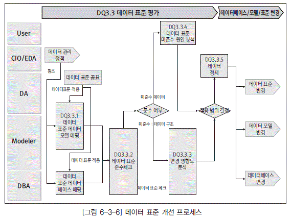[그림 6-3-6]의 DQ3.3.2 데이터 표준 준수 체크는 데이터 표준과 데이터 객체(데이터 모델, 데이 터베이스 객체) 간에 데이터 표준을 준수하고 있는지를 체크하는 과정이다. 각 기관이 제정한 데이 터 표준(표준 용어, 표준 도메인, 명명 규칙 등)에 대해 각각의 데이터 모델 객체, 데이터베이스 객 체들이 표준을 준수하고 있는지 체크한다. 이러한 단계들은 통상적으로는 주기적으로 수행된다.