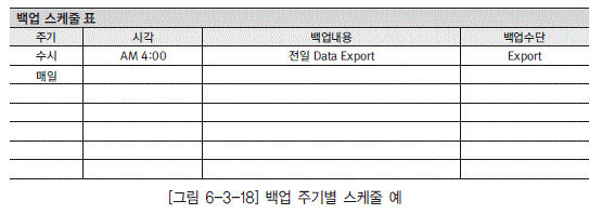 [그림 6-3-17]의 DQ6.1.2 백업 주기 및 스케줄 정의는 어떠한 장애가 발생되더라도 사용 중인 데 이터의 완전 복구가 가능하도록 백업 주기 및 스케줄이 정의되어야 한다. 따라서 일 단위, 주 단위, 월 단위, 년 단위의 백업 주기별 백업 내용을 정의해 관리해야 한다. 백업 주기별 스케줄 표는 [그 림 6-3-18]과 같은 형식으로 작성할 수 있다.