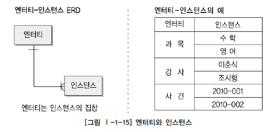 [그림 Ⅰ-1-15]에서 과목, 강사, 사건은 엔터티에 해당하고 수학, 영어는 과목이라는 엔터티의 인스턴스이고 이춘식, 조시형은 강사라는 엔터티의 인스턴스이며 사건번호인 2010-001, 2010-002는 사건 엔터티에 대한 인스턴스에 해당한다.