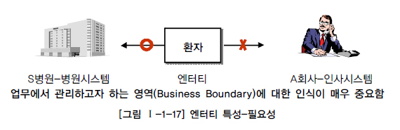 사람이 살아가면서 환자는 발생할 수 밖에 없다. 그러나 일반회사의 인사시스템에서는 비록 직원들에 의해서 환자가 발생이 되지만 인사업무 영역에서 환자를 별도로 관리할 필요가 없다. 다른 예로 병원에서는 환자가 해당 업무의 가장 중요한 엔터티가 되어 꼭 관리해야 할 엔터티가 된다. 이와 같이 엔터티를 도출할 때는 업무영역 내에서 관리할 필요가 있는지를 먼저 판단하는 것이 중요하다.